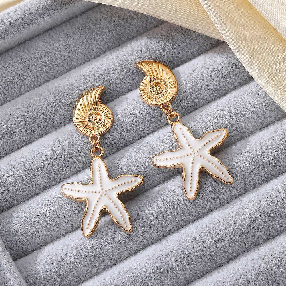 1 pair of chic golden starfish and shell earrings for girls - retro style stainless steel earrings, ideal for beach vacation, beach earrings